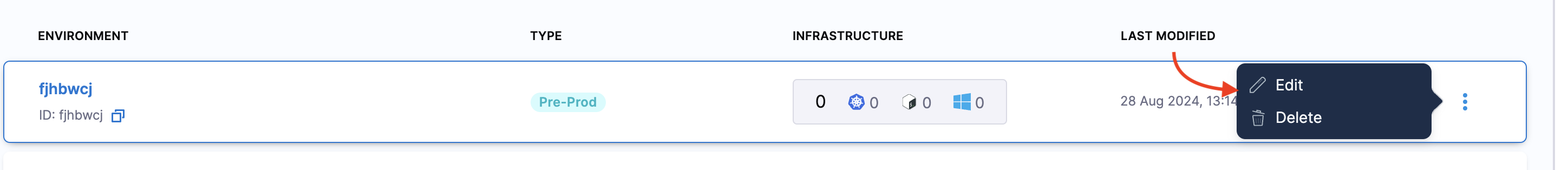 To edit or delete the environment, select the ⋮ icon against the name of the environment.