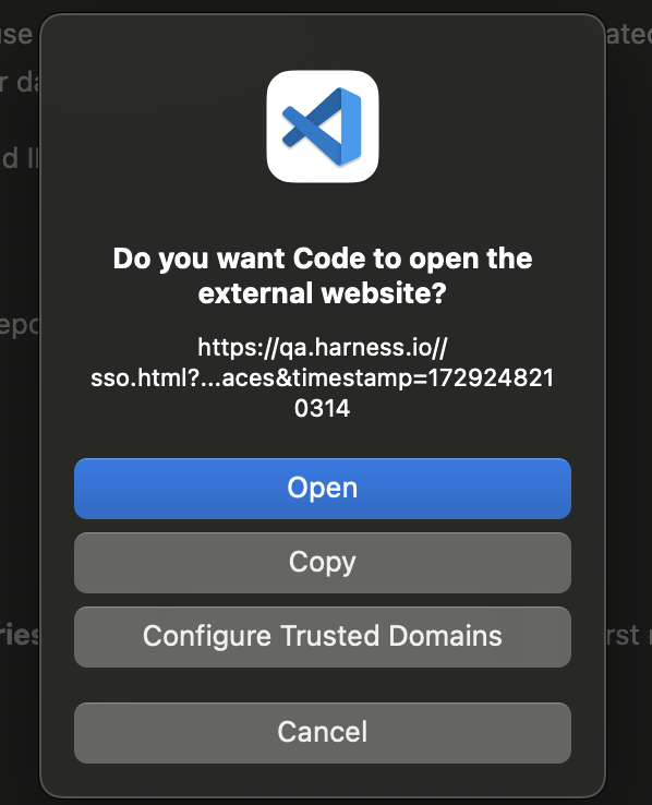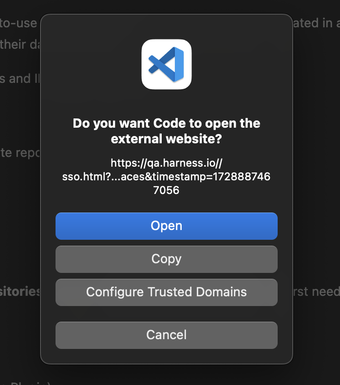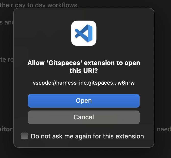1. A dialog will appear asking to open your browser for Gitspaces authentication. Click “Allow” and “Open” to proceed.