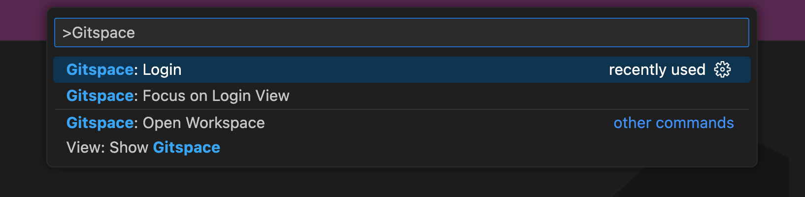 Alternatively, open the Command Palette (Ctrl+Shift+P) and type "Gitspace". Choose “Gitspace: Login” from the options.