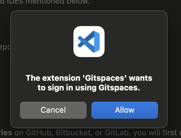 4. If the Gitspaces extension isn’t installed, VS Code will prompt you to install it. Click “Allow” and “Open” to proceed.
