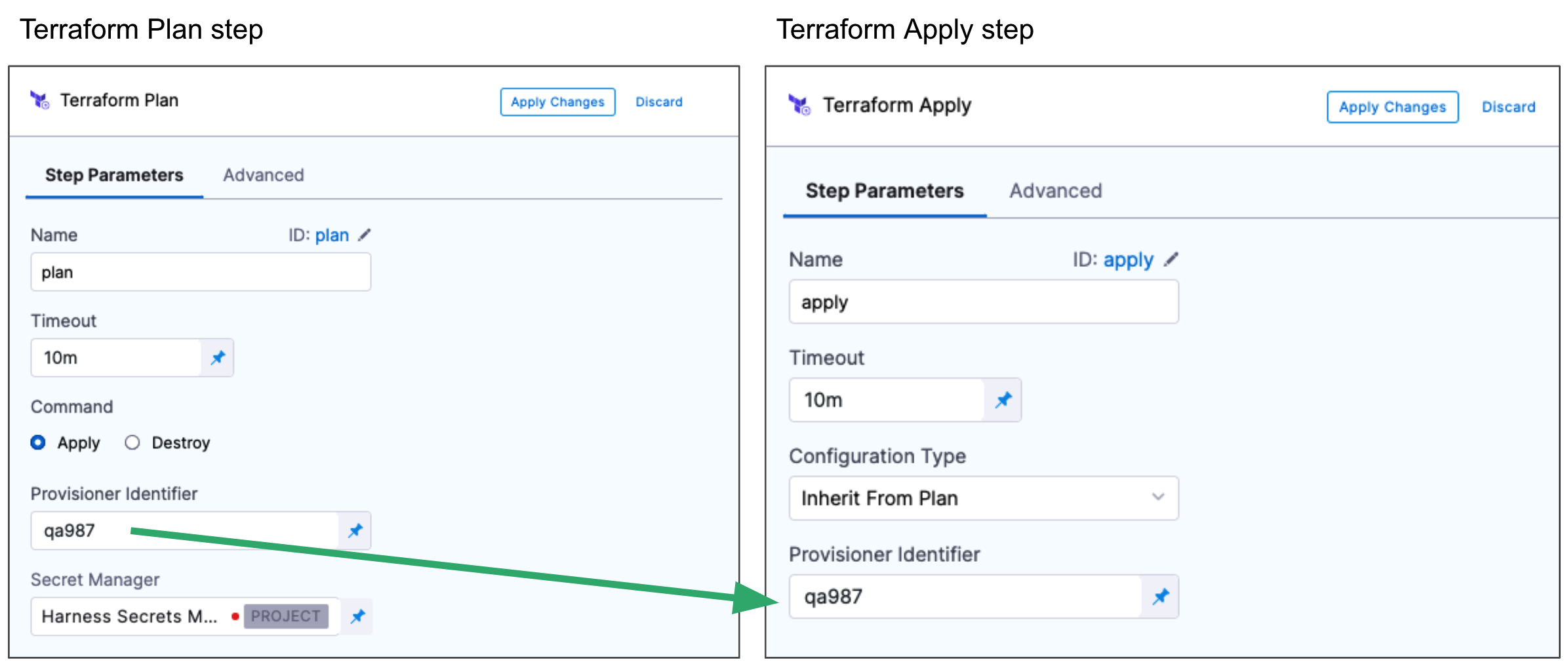 Next, you add the Terraform Apply step, select Inherit from Plan in Configuration Type, and reference the Terraform Plan step using the same Provisioner Identifier.