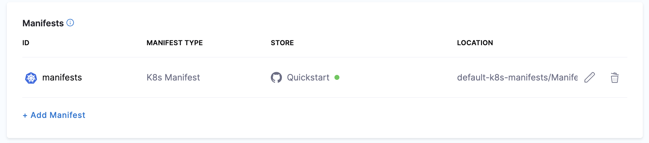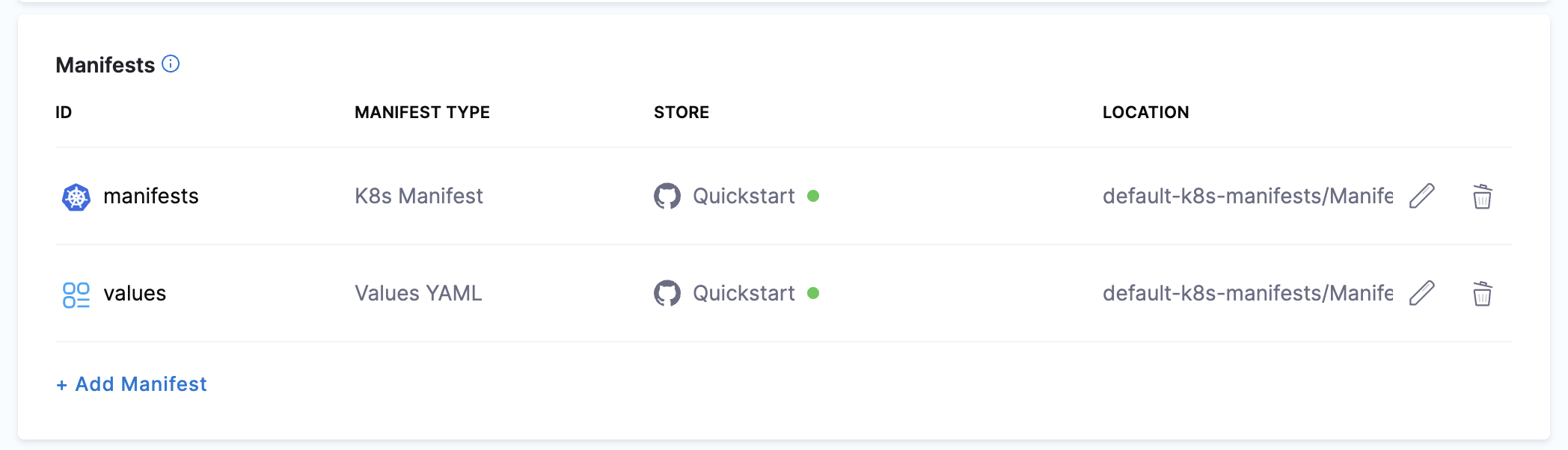 • Manifests: You can use manifests stored in a Git repo or Harness.