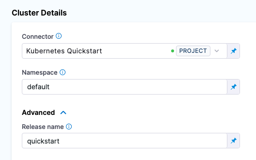 8. In Advanced, in Release name, enter quickstart. For a release name, you can use a built-in or custom expression or any text you like. Harness requires a release name for tracking. It is applied to the pods as a label. The release name must be unique across the cluster.