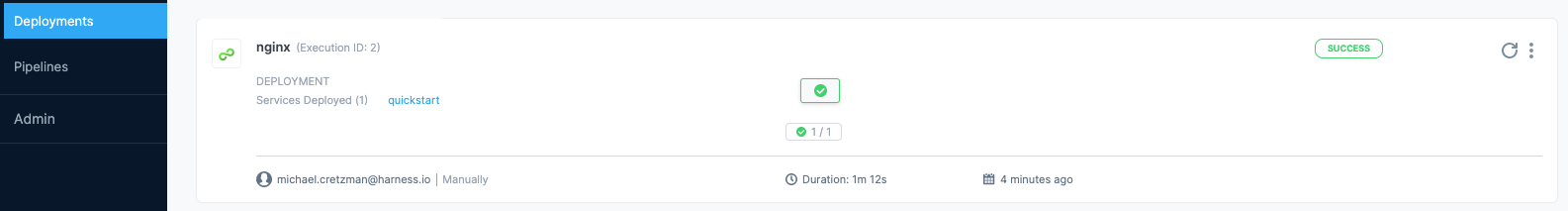 3. Select Run Pipeline. Harness will verify the Pipeline and then run it. You can see the status of the deployment, and pause or abort it.