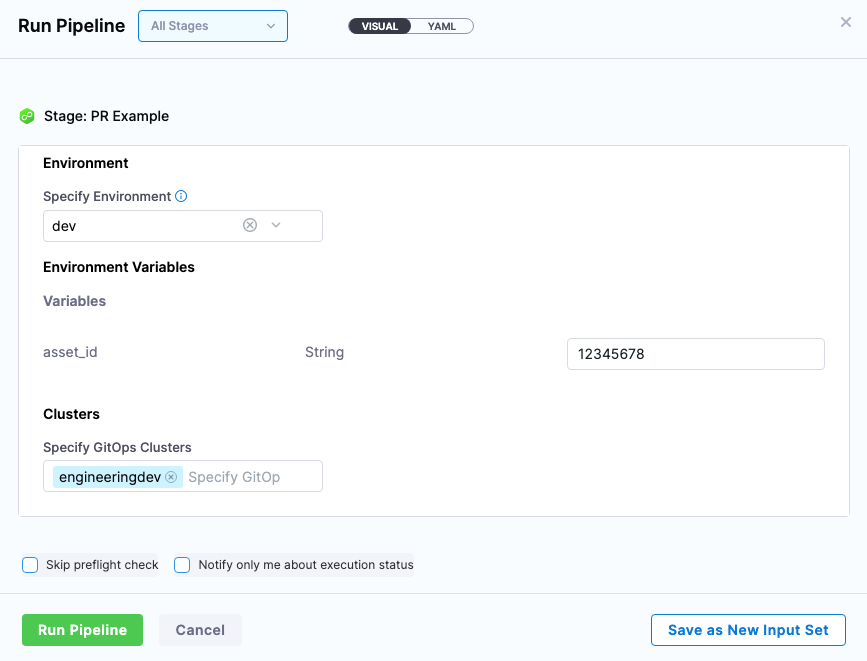 For the stage environment, we'll use a Harness runtime input. When you run the pipeline, Harness will prompt you for a value for the environment. You can select the environment you want to use for the PR.