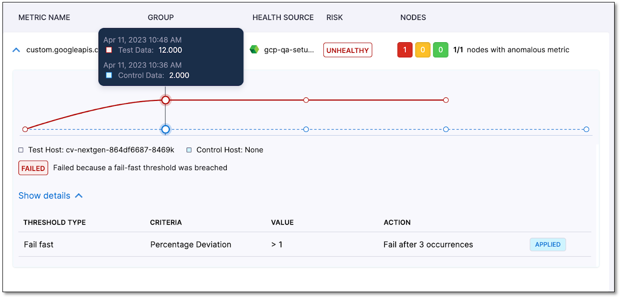 The metric details graph provides a comprehensive view of the actual metric data, including comparative analysis, metric thresholds, and the reasons for any failures.