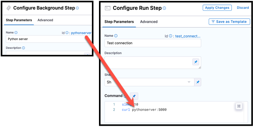 You can reference services started in Background steps by using the Background step's Id in your Run step's Command. For example, a cURL command could call BackgroundStepId:5000 where it might otherwise call localhost:5000. The exact format depends on your build infrastructure. For more information, go to Background step settings - Name and ID and Background step settings - Port Bindings.