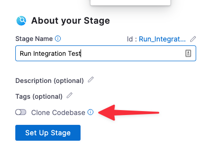 Run integration testfor the Name, disable Clone Codebase, and then select Set Up Stage.