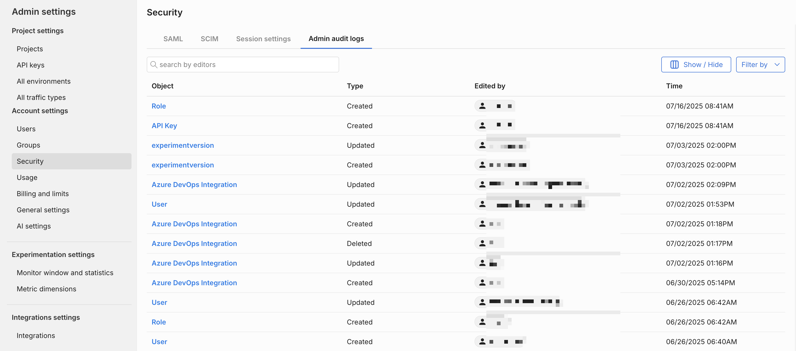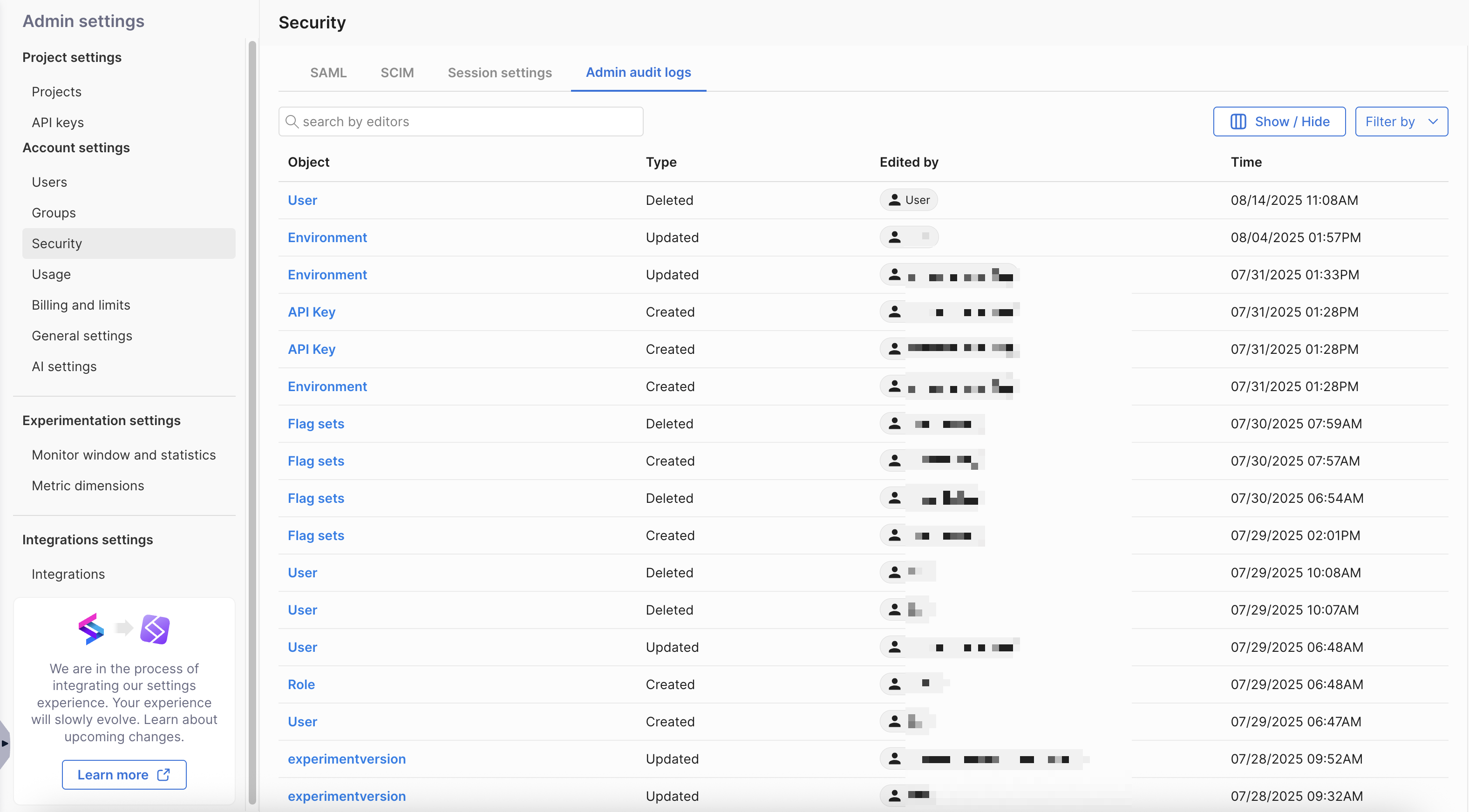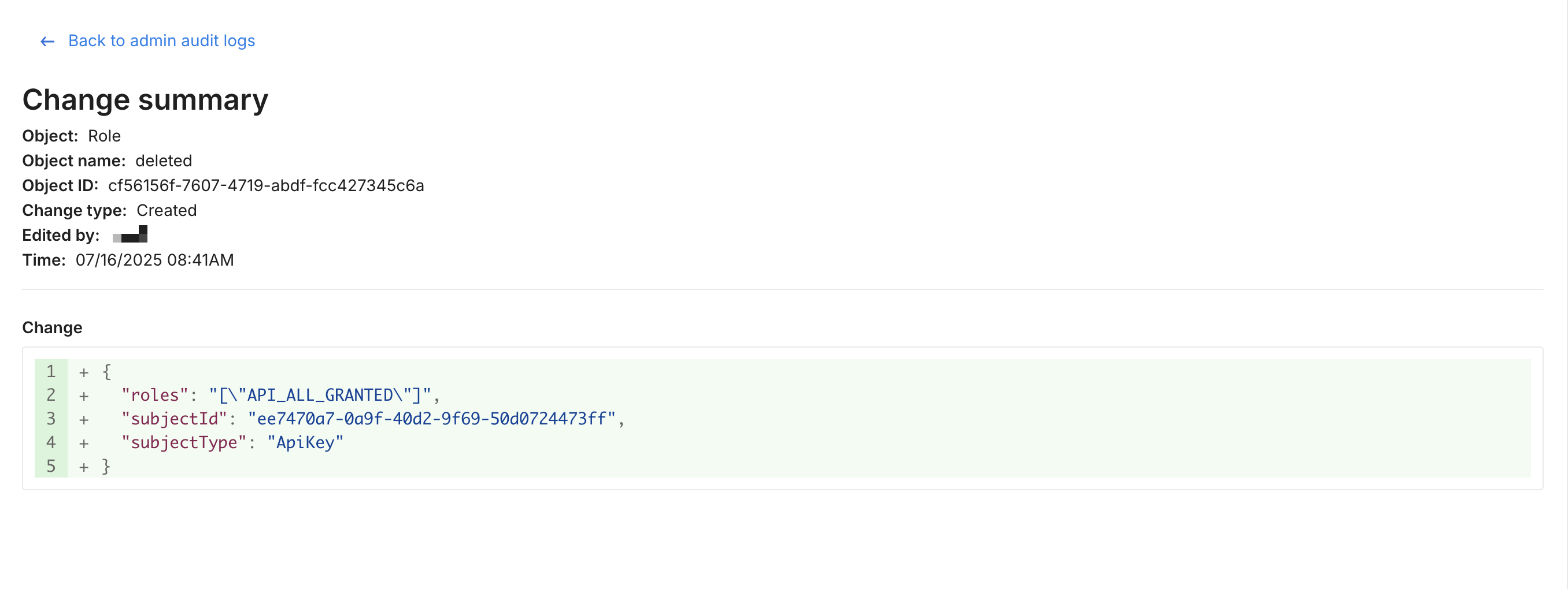 Admin audit logs are captured every time an admin creates, changes, or deletes any of the below objects. These logs provide detailed records of every change that took place and who made them.