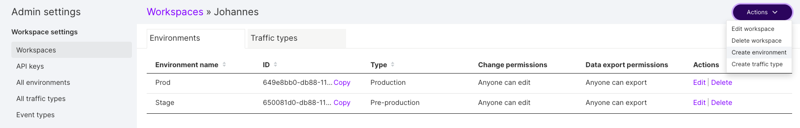 - Add additional environments by clicking Create environment.
