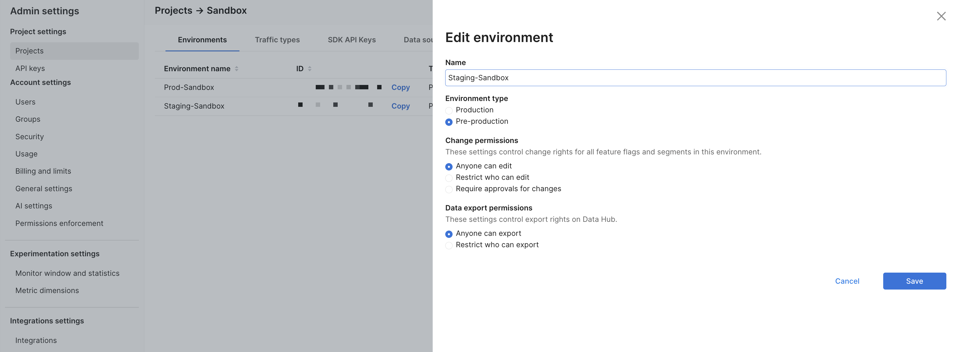 | Approvals | Configure approval workflows for feature flags and segments. | Required approvals for changes: Toggle on/off to enforce approvals. Approval type: Choose one of the following radio buttons. - Let submitters choose their approver(s) - Restrict who can approve (select users or groups) |