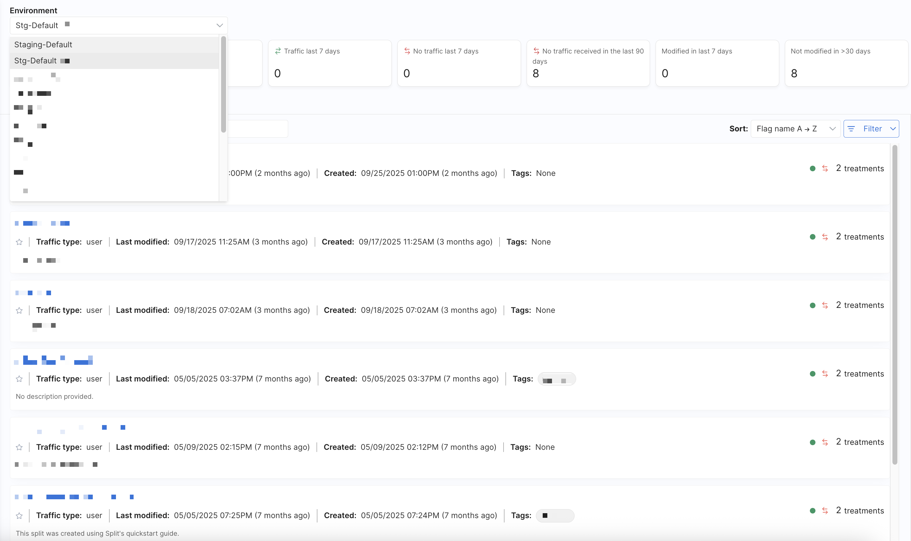 Using the Environment dropdown menu, you can select an environment to display all configured feature flags along with their current status (Active or Killed) and recent traffic activity. You can filter feature flags by name in the search bar, use the Sort dropdown menu to order flags by name, last modified date, or creation date, in addition to a Filter dropdown menu to narrow results by traffic type, tag, status, or traffic activity.