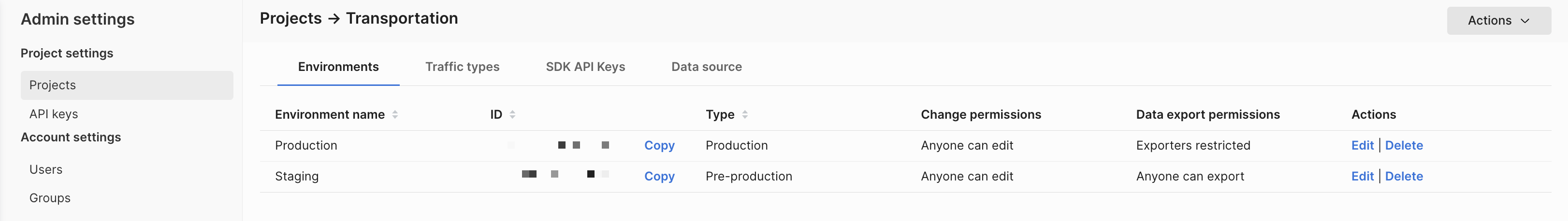 When you first create your account, you are provided with two environments. To manage your environments, go to the Projects tab in your Admin settings page. Select the project that you want to edit environments for. You can:
