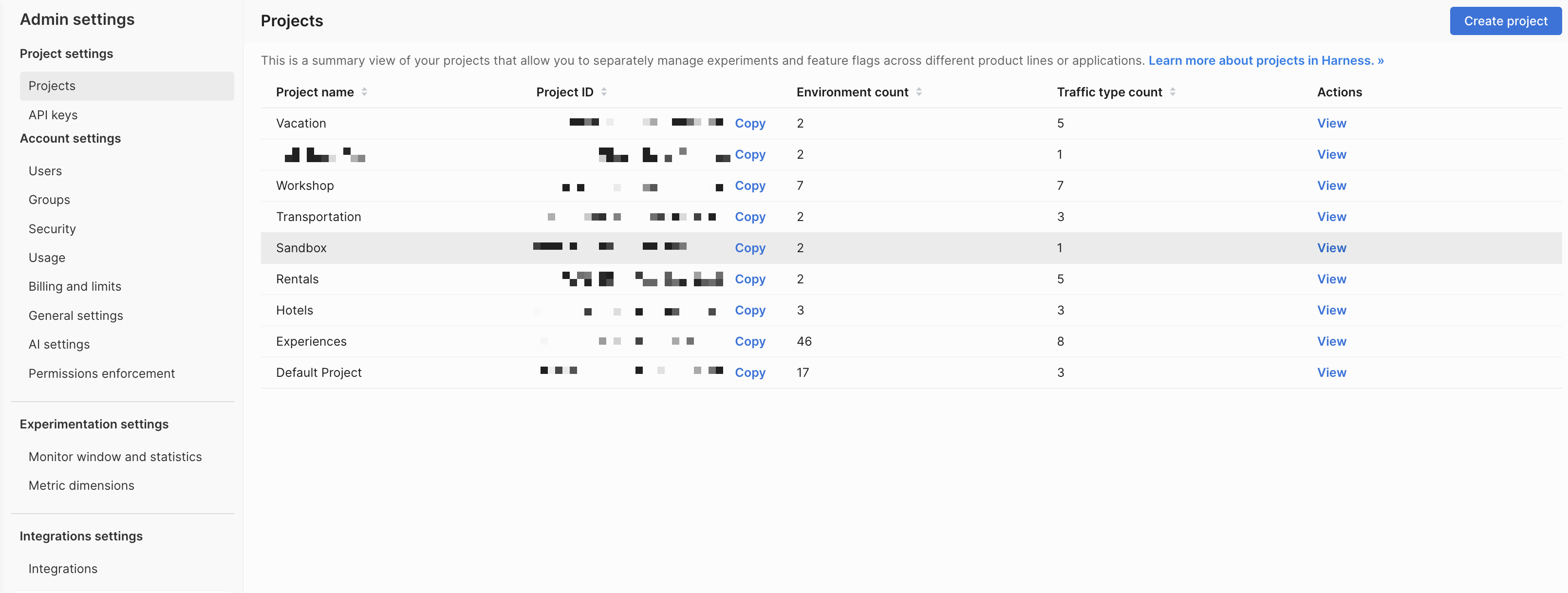 Click View under the Actions column for the project you want to create an environment in.