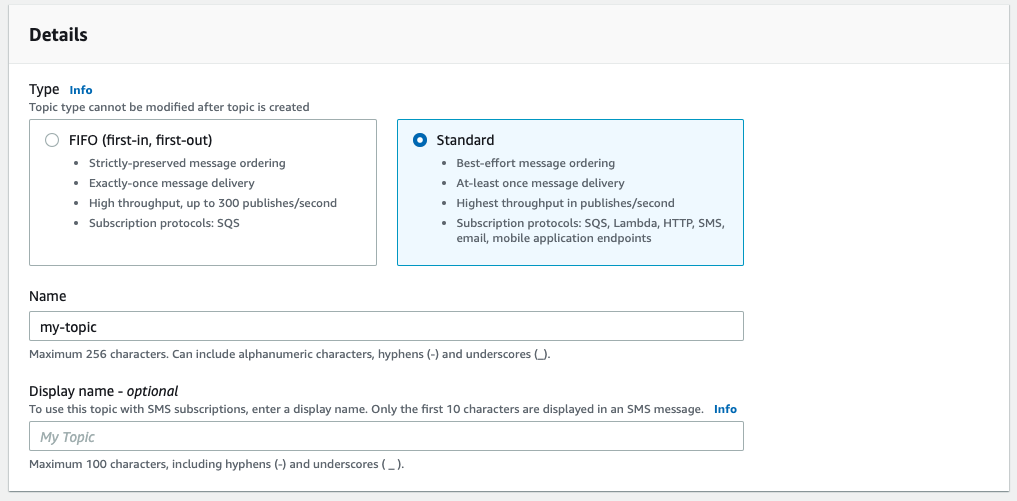 3. Create a Name for your SNS topic, e.g. "fme-events".