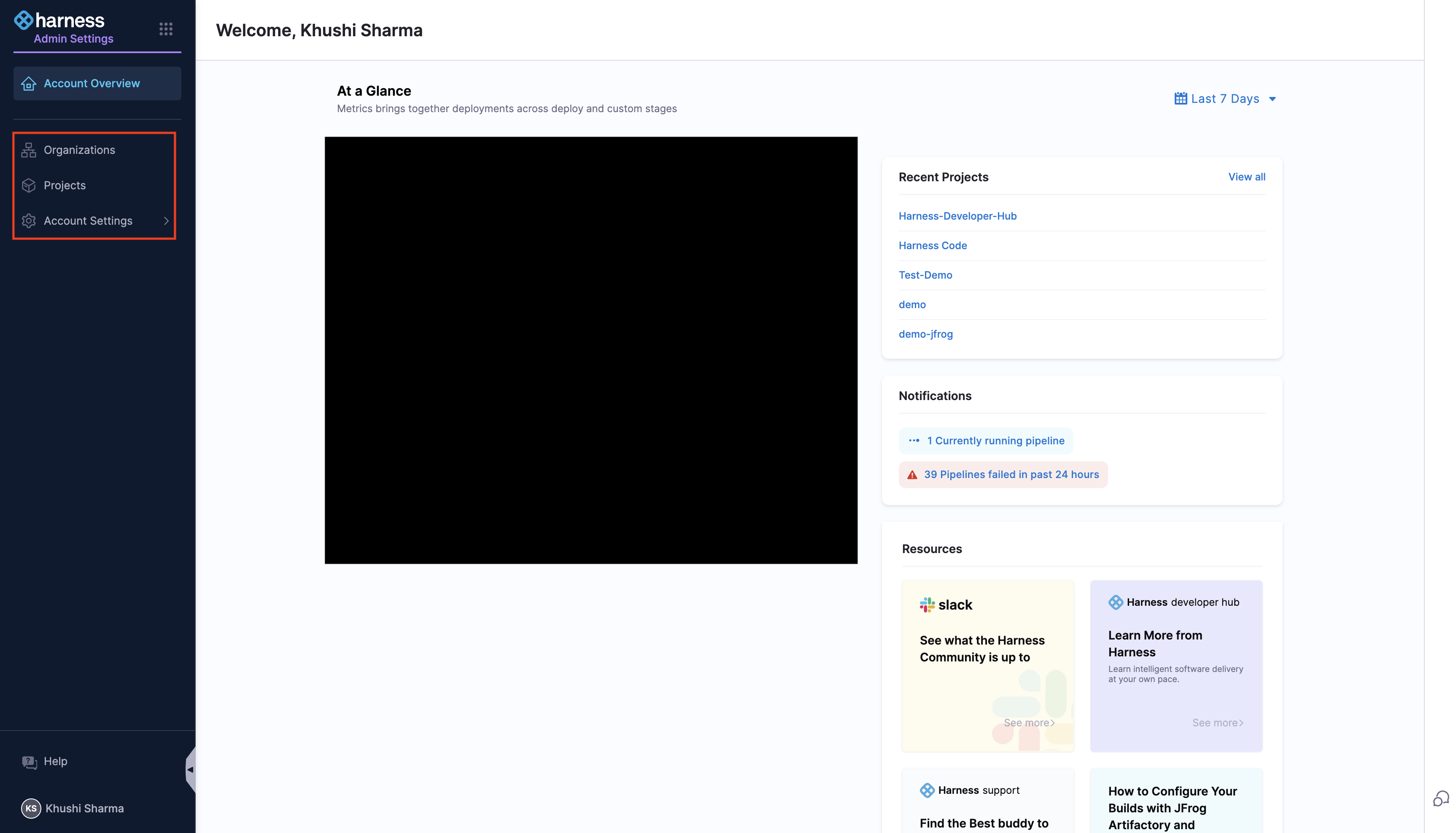 The Account Scope is the highest level. It represents your Harness account and encompasses all resources within your subscription. Resources created at the account scope are accessible platform-wide. Permissions for resources created at this level can be configured using granular RBAC and shared across user groups.