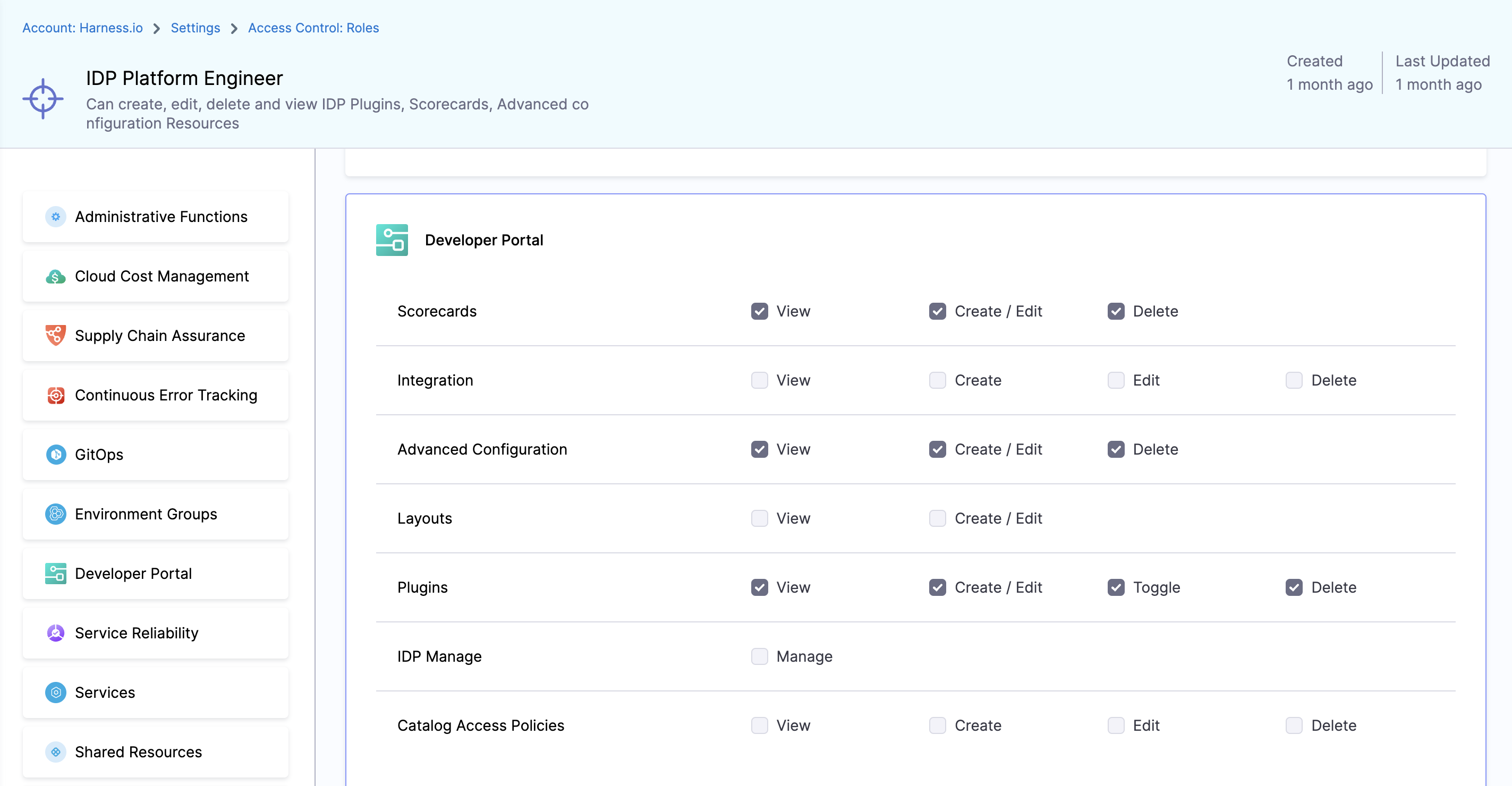 All IDP resources can exist at different scopes, but their permissions and access levels depend on the RBAC settings you apply. With granular RBAC, you can use predefined roles or define custom roles with specific permissions and organize them into reusable resource groups. These permissions are fully aligned with the existing Harness RBAC framework.