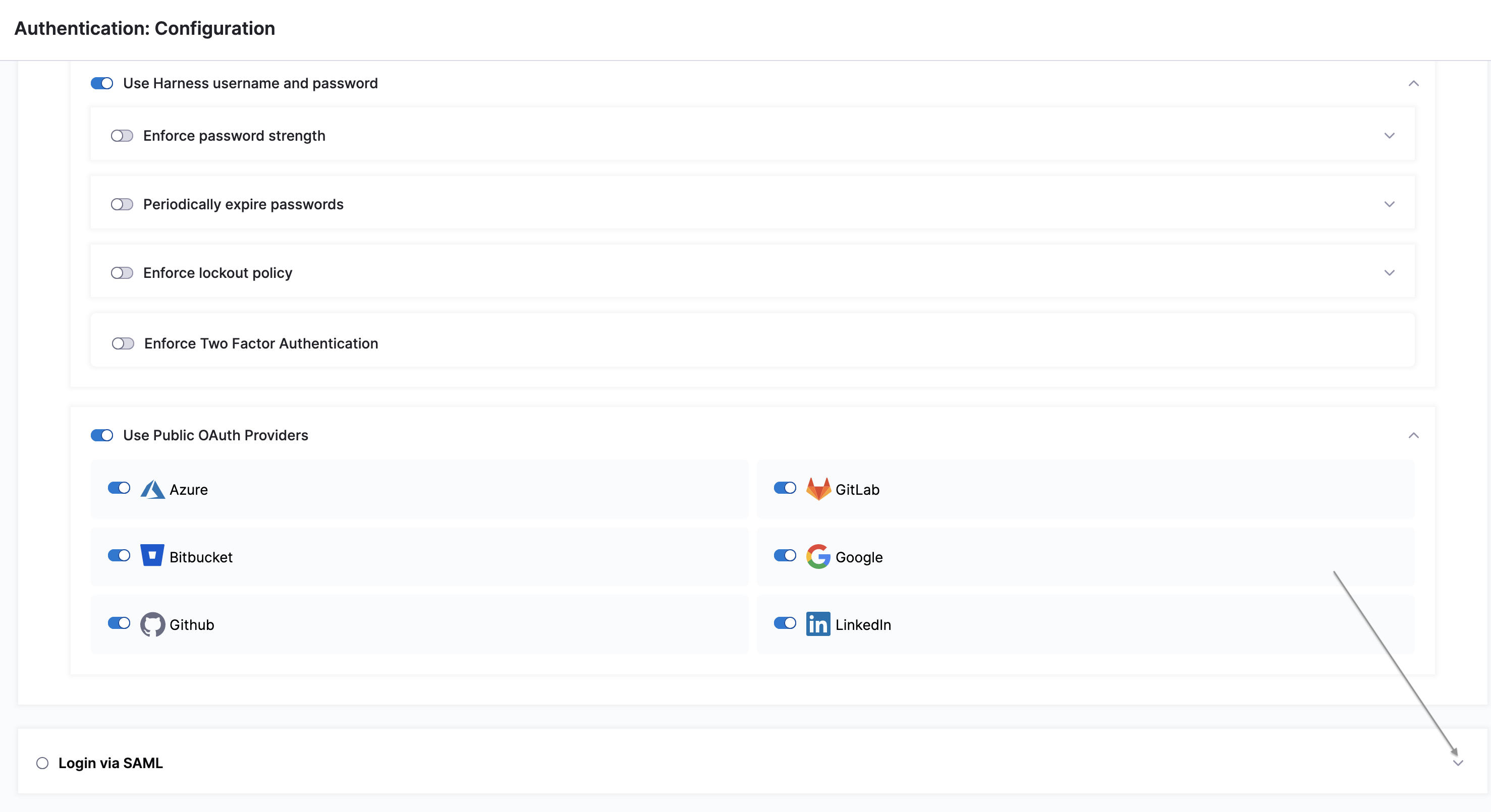 5. Select Add. The new SSO provider is displayed under Login via SAML. You might need to expand this section using the arrow on the right-hand side of the screen.