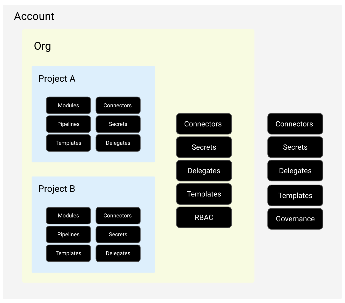 Within a Harness account, you have organizations, and within organizations you have projects.