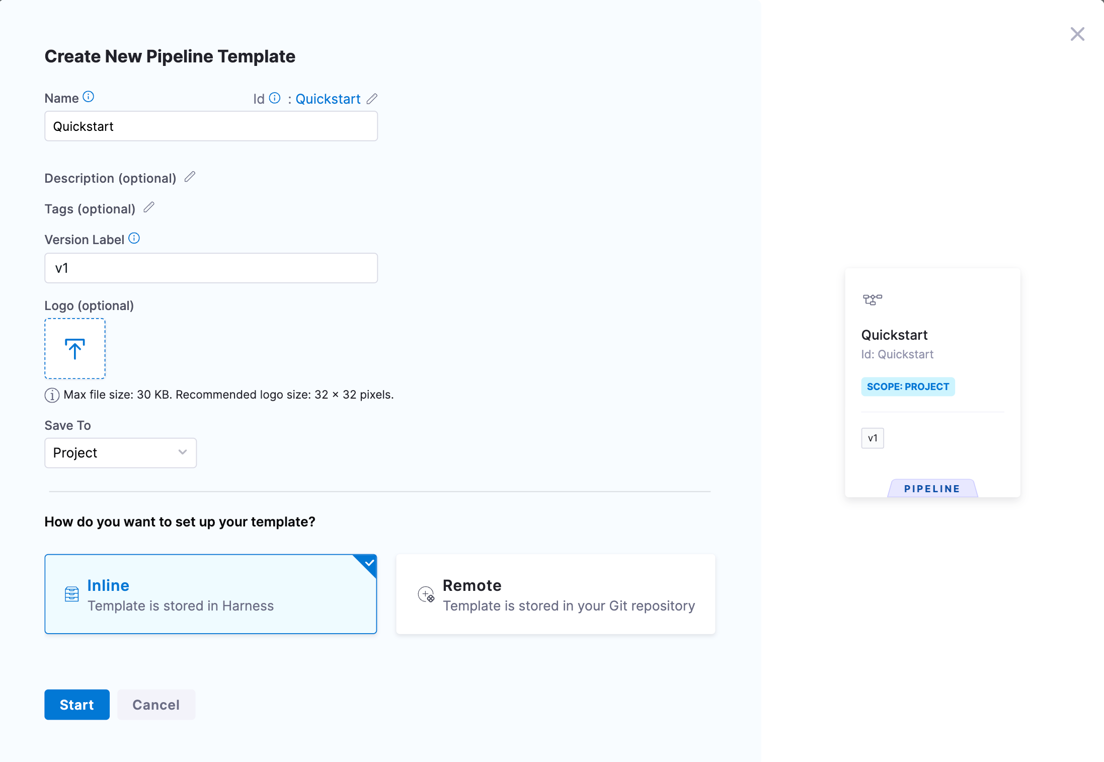 5. Set up the template to be stored inline (in the Harness Platform) or in a remote Git repo.