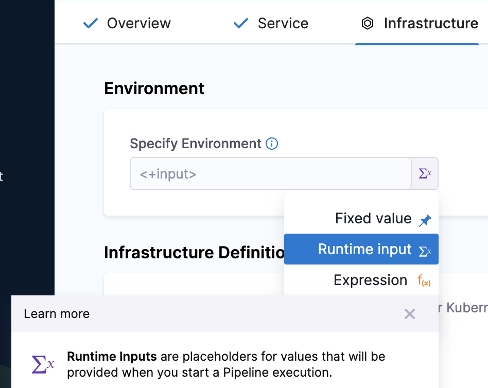 1. In Infrastructure, in Specify Environment, select the setting for your pipeline execution, for example, Runtime input. Harness pipelines allow you to use fixed values, runtime inputs, and expressions. Environments represent your deployment targets logically (QA, Prod, etc). You can add the same environment to as many stages as you need.