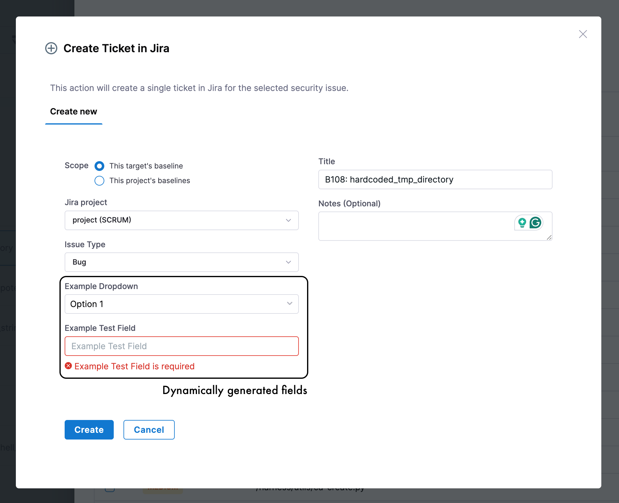 The fields shown in the Create Ticket in Jira dialog are dynamically populated based on the selected project and issue type. Only required fields are displayed.