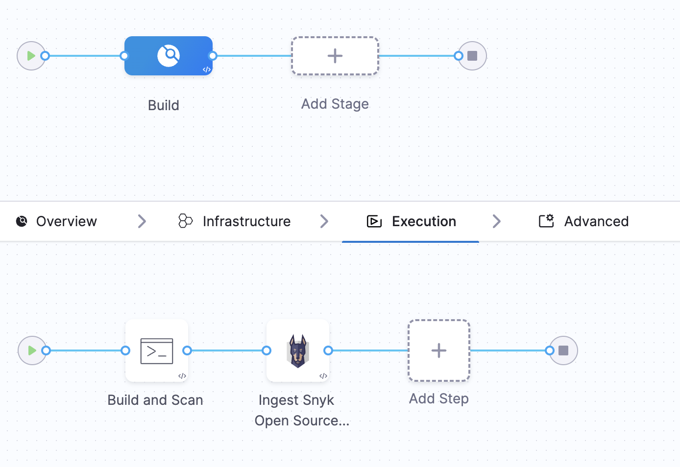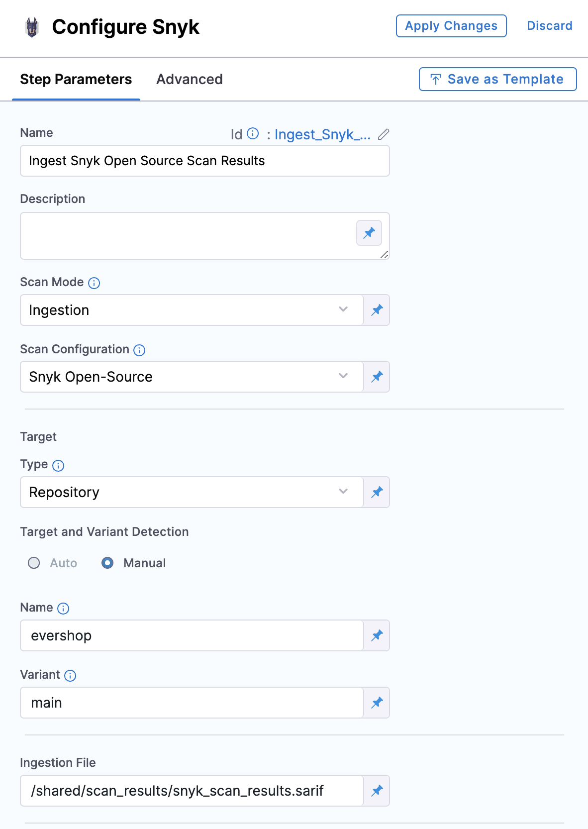 - Ingestion mode: In this mode, the Snyk step reads scan results from a data file, normalizes the data, and deduplicates it.