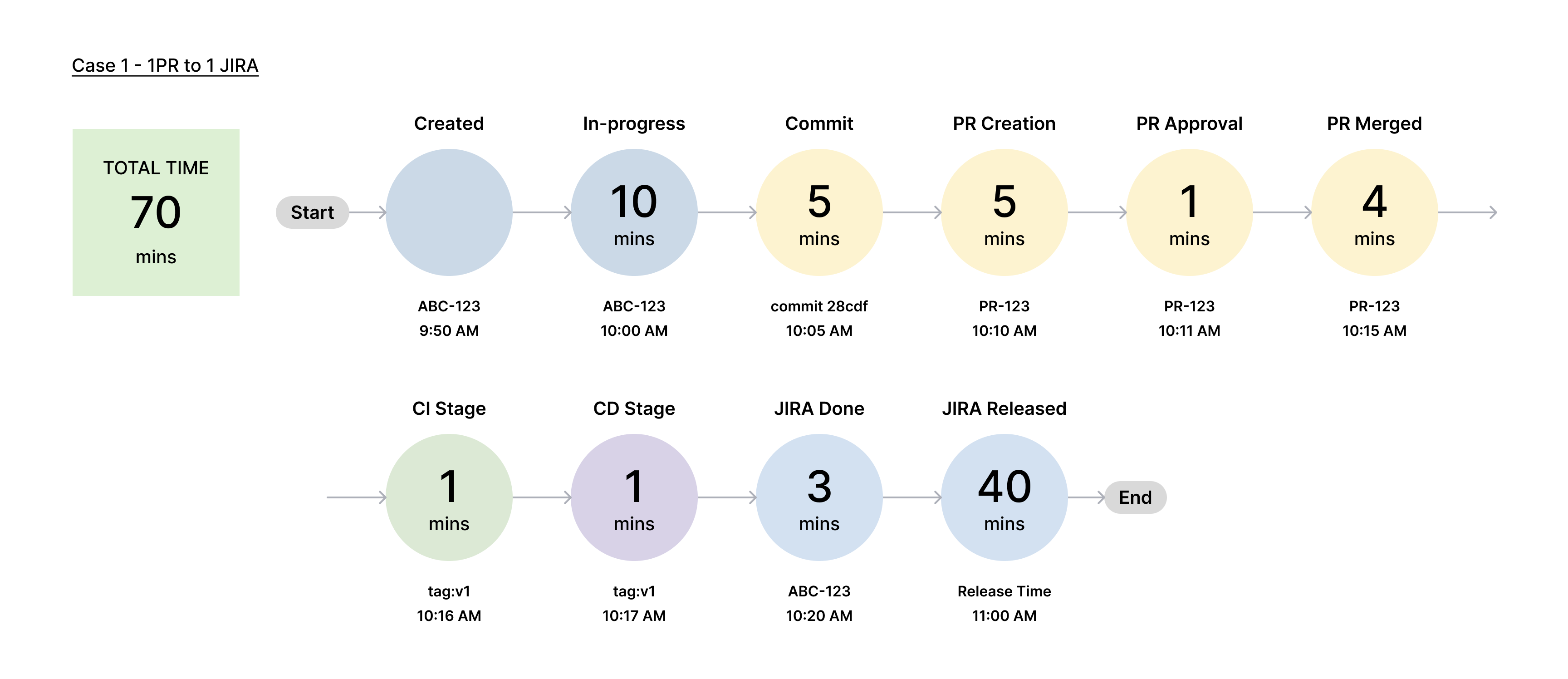 | First Release Time | The time at which the fix version added to the issue is released in Jira after the issue was marked as Done for the first time. | Jira Release Time - Time at which the JIRA was marked as Done status for the First Time | 11:00 AM - 10:20 AM = 40 minutes |
