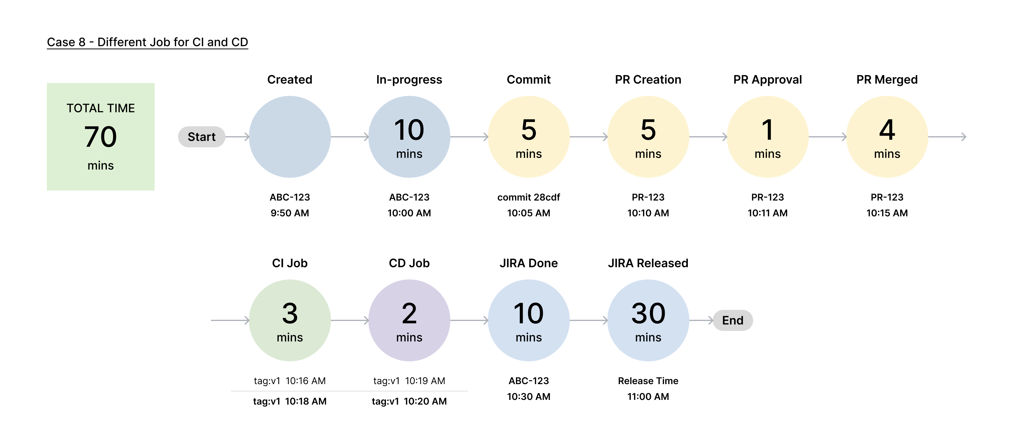 In this case, the First Continuous Integration Time and First Continuous Deployment Time stages represent the separate times taken for the CI and CD processes, respectively, as they are handled by different jobs.