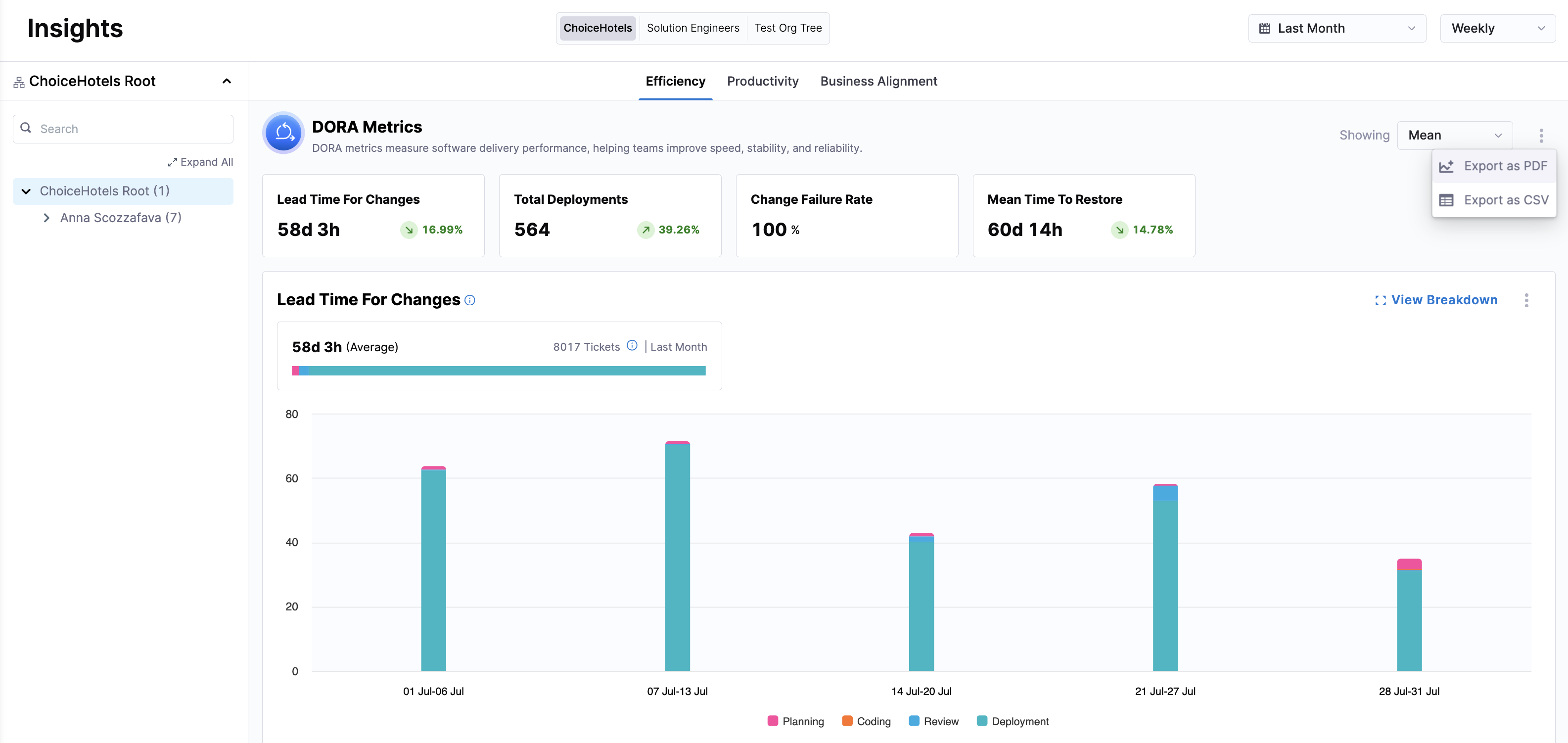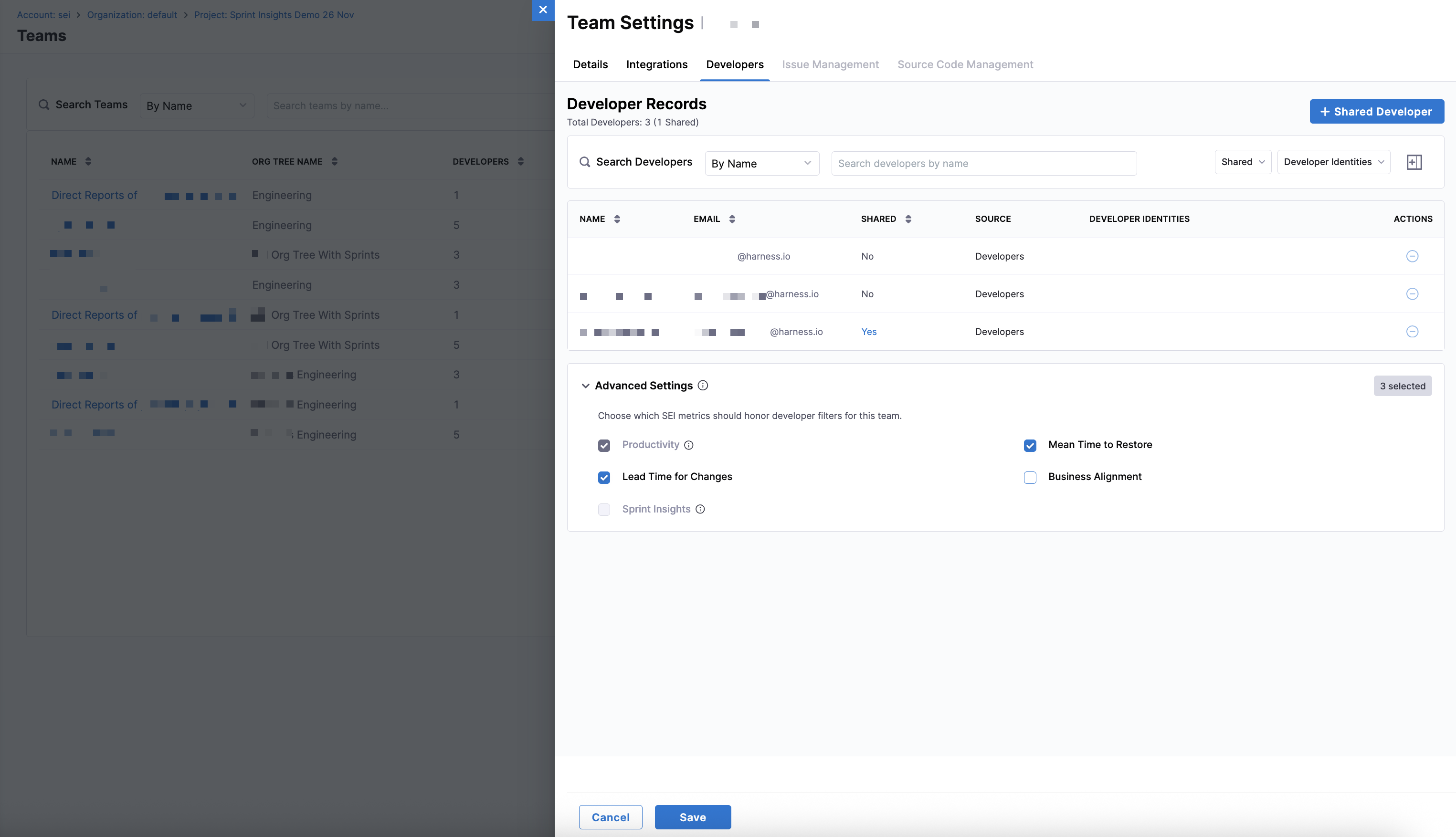 Harness SEI now supports metric-level developer filtering, giving teams explicit control over which insights should honor developer filters at the team level. By default, developer filters are applied to Productivity and Lead Time for Changes.