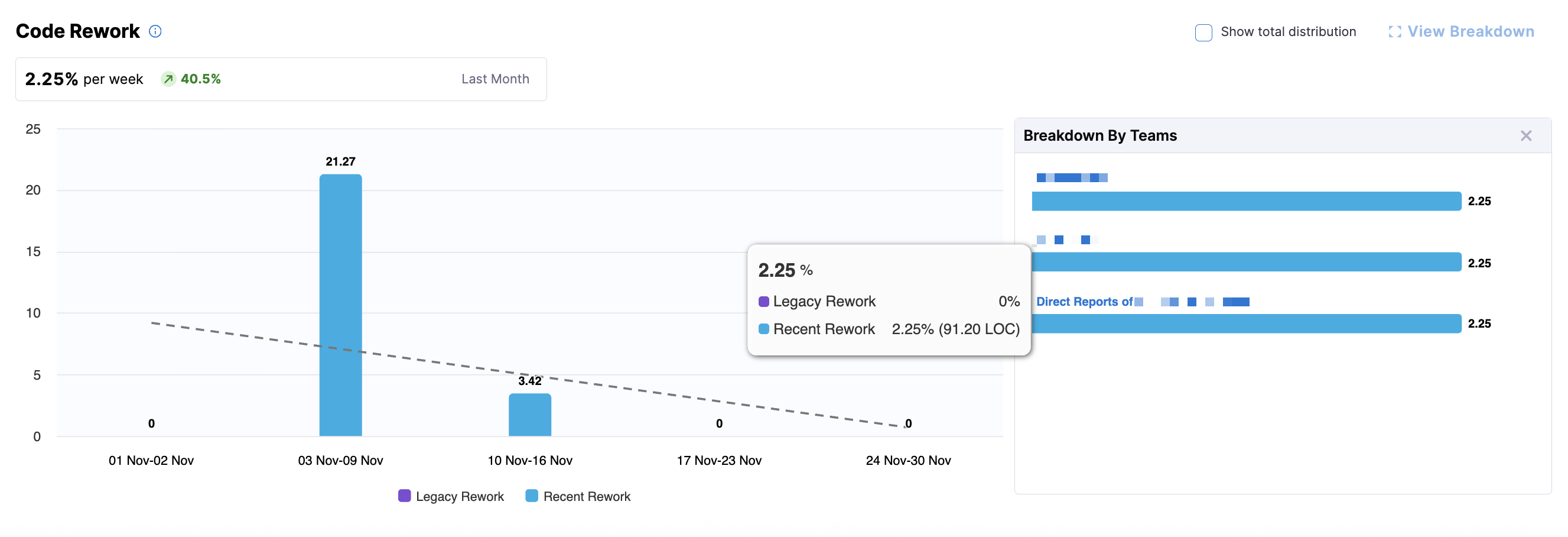 Code Rework provides two levels of drilldown: a high-level view showing aggregated metrics per team, and a per-developer view that lets you analyze detailed metrics and the split between recent and legacy rework.